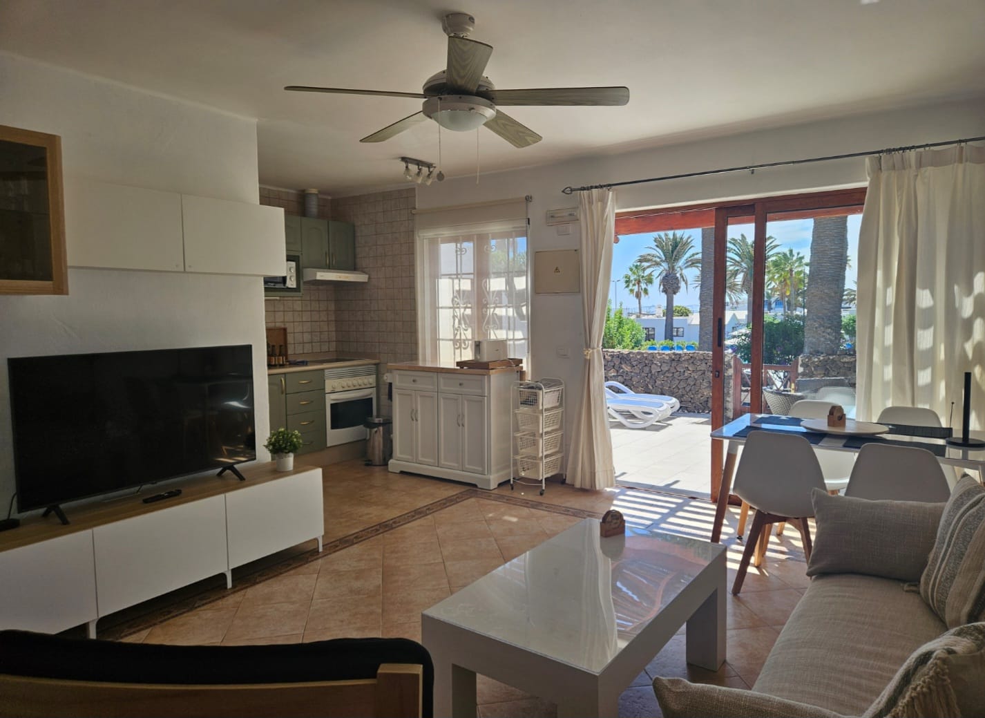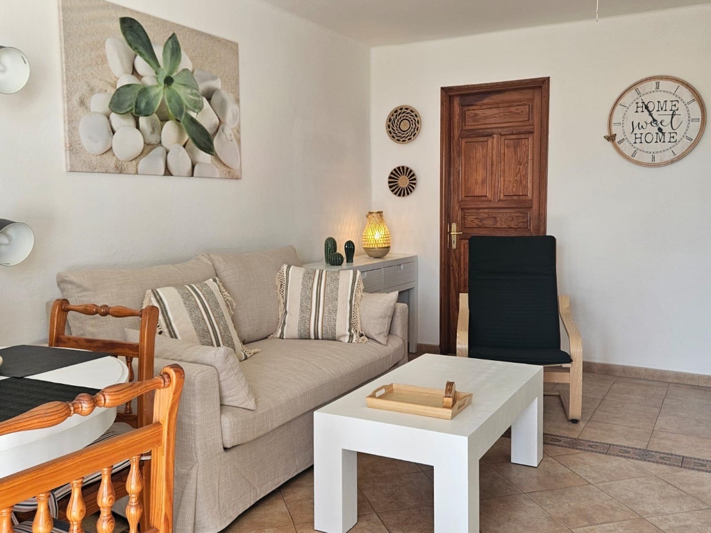 Esta vivienda se encuentra en una zona tranquila dentro del complejo Casas del Sol, a solo unos minutos caminando del paseo marítimo y de la zona comercial de Playa Blanca.